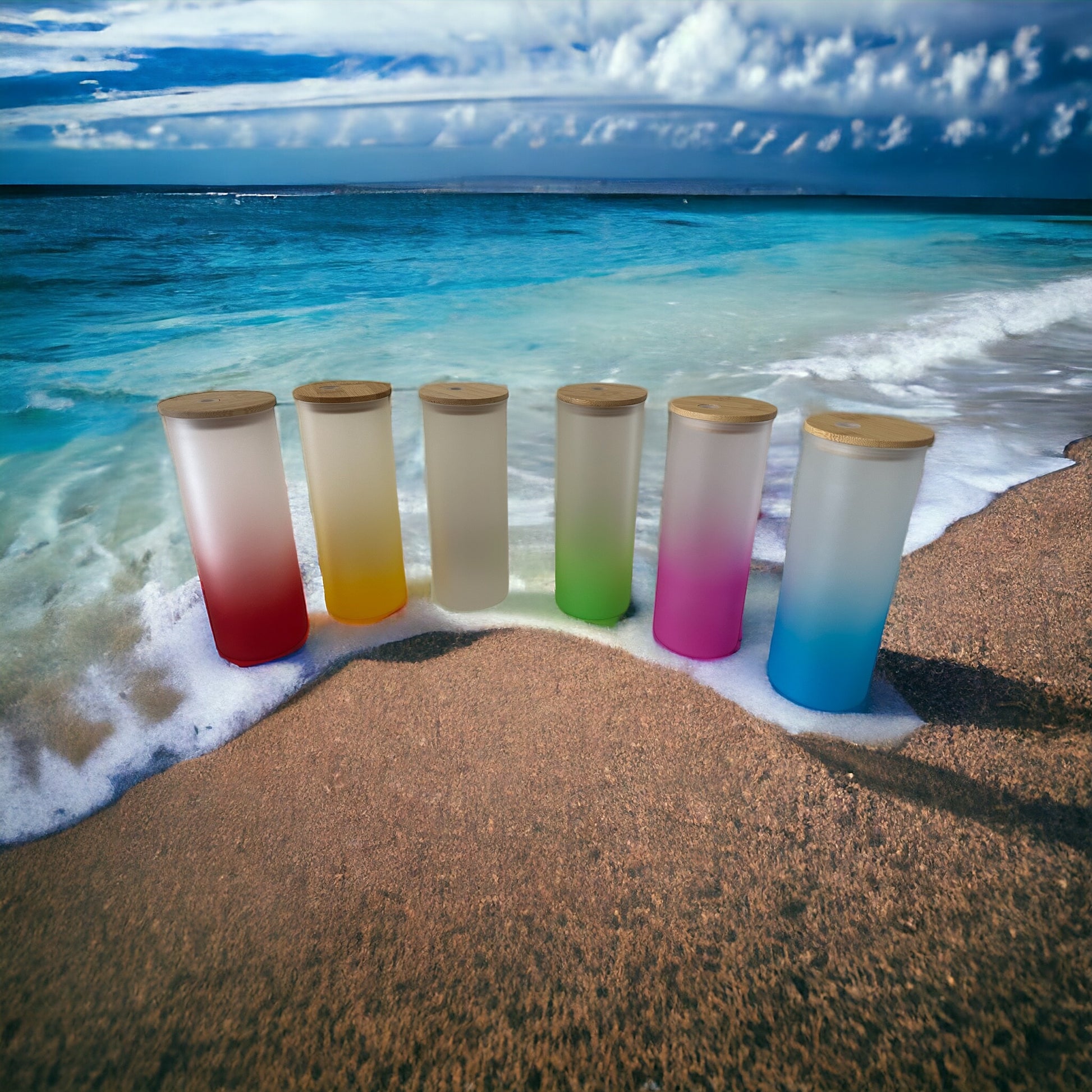 25 ounce ombre glass tumbler that includes a bamboo lid and straw.