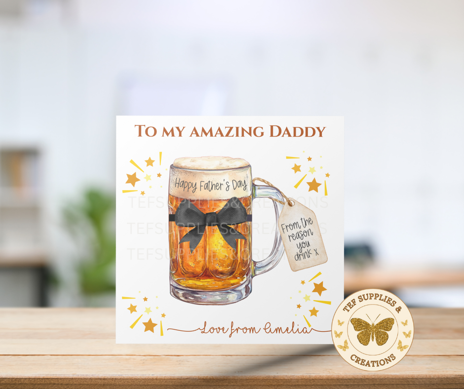 This personalized square Father’s Day card blends charm and cheer, perfect for the beer-loving dad. The front showcases a detailed illustration of a frosty glass of golden beer, its foam spilling slightly over the rim, set against a textured background that evokes rustic pub vibes or a cozy home bar. Your custom message—like “Cheers to You, Dad!” or the recipient’s name—is stylishly printed above or below the image in a bold, modern font. Inside, there’s space for a heartfelt message, or you can personalize it with your own text. Printed on premium-quality cardstock, this card makes a fun, thoughtful, and uniquely tailored way to raise a glass to Dad.